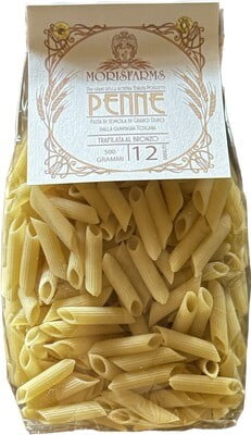 Penne Pasta, 100% Toscane en traditioneel gemaakt door Morisfarms. Van de velden van het landgoed Poggetti in de Toscaanse Maremma van Morisfarms, presenteren wij u hun pasta van harde tarwe, gemaakt volgens de traditie met een bronzen matrijs die een pasta oplevert met een bijzonder stevige grip waardoor de saus aan elke hap blijft kleven. Samen met een glas Morisfarms wijn is deze Penne pasta een uitstekende manier om de eenvoudige maar authentieke smaken te proeven. 100% in Toscane geproduceerd.